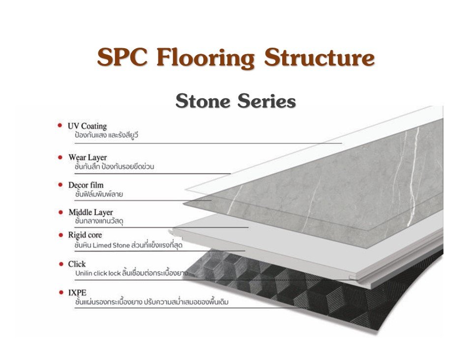 ความหนา : 5.5 มิลลิเมตร (SPC 4 +IXPE 1.5) ขนาดแผ่น : 300 x 600 mm (12″x 24″)ผิวเคลือบ : 0.5 มิลลิเมตร ขนาดบรรจุ : 8 แผ่น (1.4864 ตรม.)