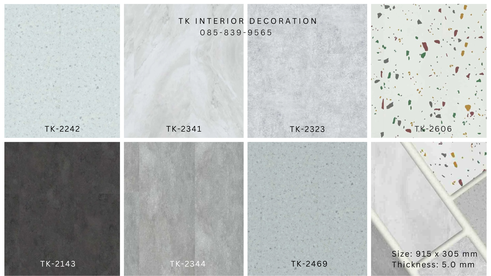 ความหนา : 5.5 มิลลิเมตร (SPC 4 +IXPE 1.5) ขนาดแผ่น : 300 x 600 mm (12″x 24″)ผิวเคลือบ : 0.5 มิลลิเมตร ขนาดบรรจุ : 8 แผ่น (1.4864 ตรม.)